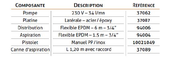 L’équipement de distribution 230 V - IP55 débite 34 l/Mn. Il est préconisé pour la distribution de l’AdBlue, composé d’un flexible de distribution EPDM de 6m, d’une canne d’aspiration avec adaptateur trisure, d’un flexible d’aspiration de 1,5 m EPDM, d’un pistolet de distribution standard HQ, d’une platine adaptable sur maxi-fût 1 000 litres et d’un repose-pistolet, l’ensemble se positionne de façon latérale sur le contenant.